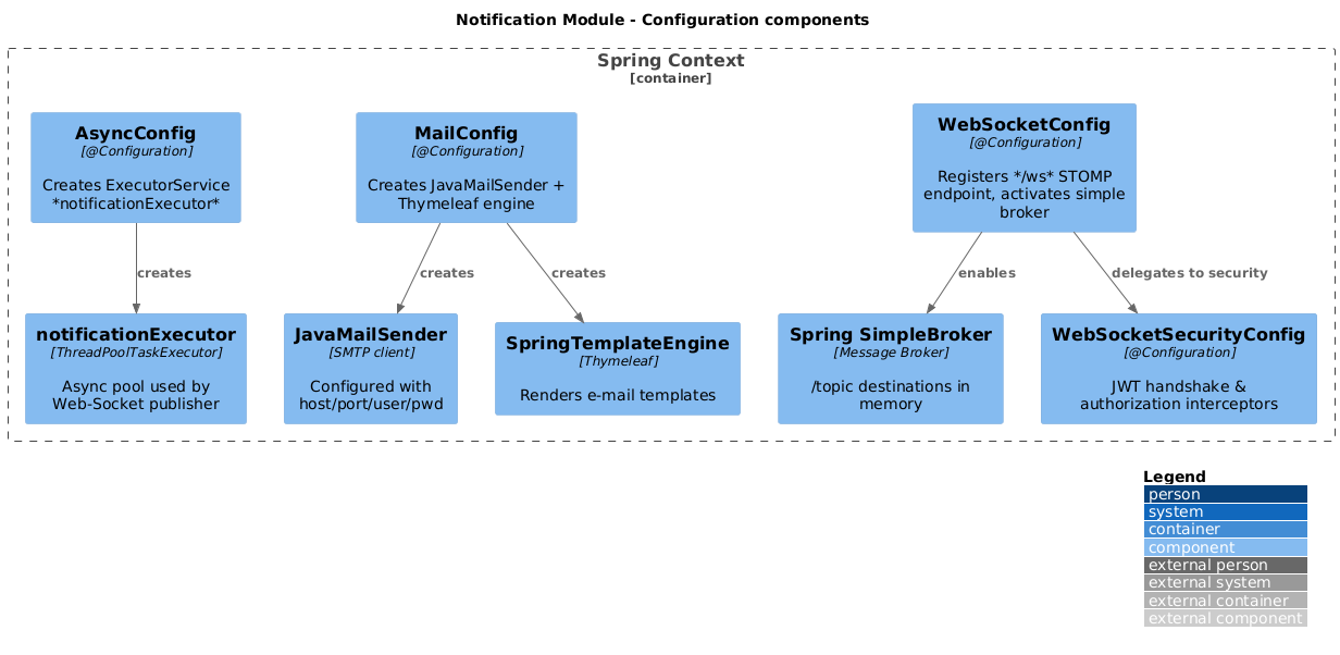 | AsyncConfig | Declares the notificationExecutor bean (fixed-size ThreadPoolTaskExecutor) used for non-blocking Web-Socket pushes. | Spring @Configuration | — |
