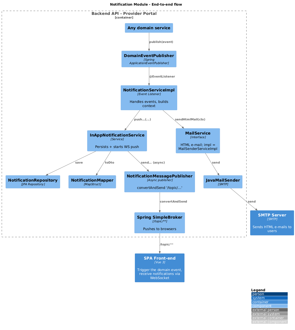 | InAppNotificationService | Persistence + delivery of notifications: saves the entity, converts to DTO, and schedules Web-Socket broadcast. | pushToUser, pushToProvider | NotificationRepository, NotificationMapper, NotificationMessagePublisher |