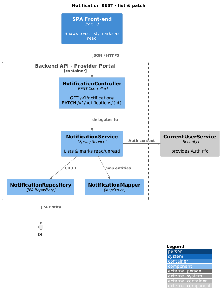 | NotificationService | Authorisation + orchestration layer for REST: filters by AuthInfo, calls repository and mapper. | list(AuthInfo, unreadOnly), markRead(AuthInfo,id,flag) | NotificationRepository, NotificationMapper |