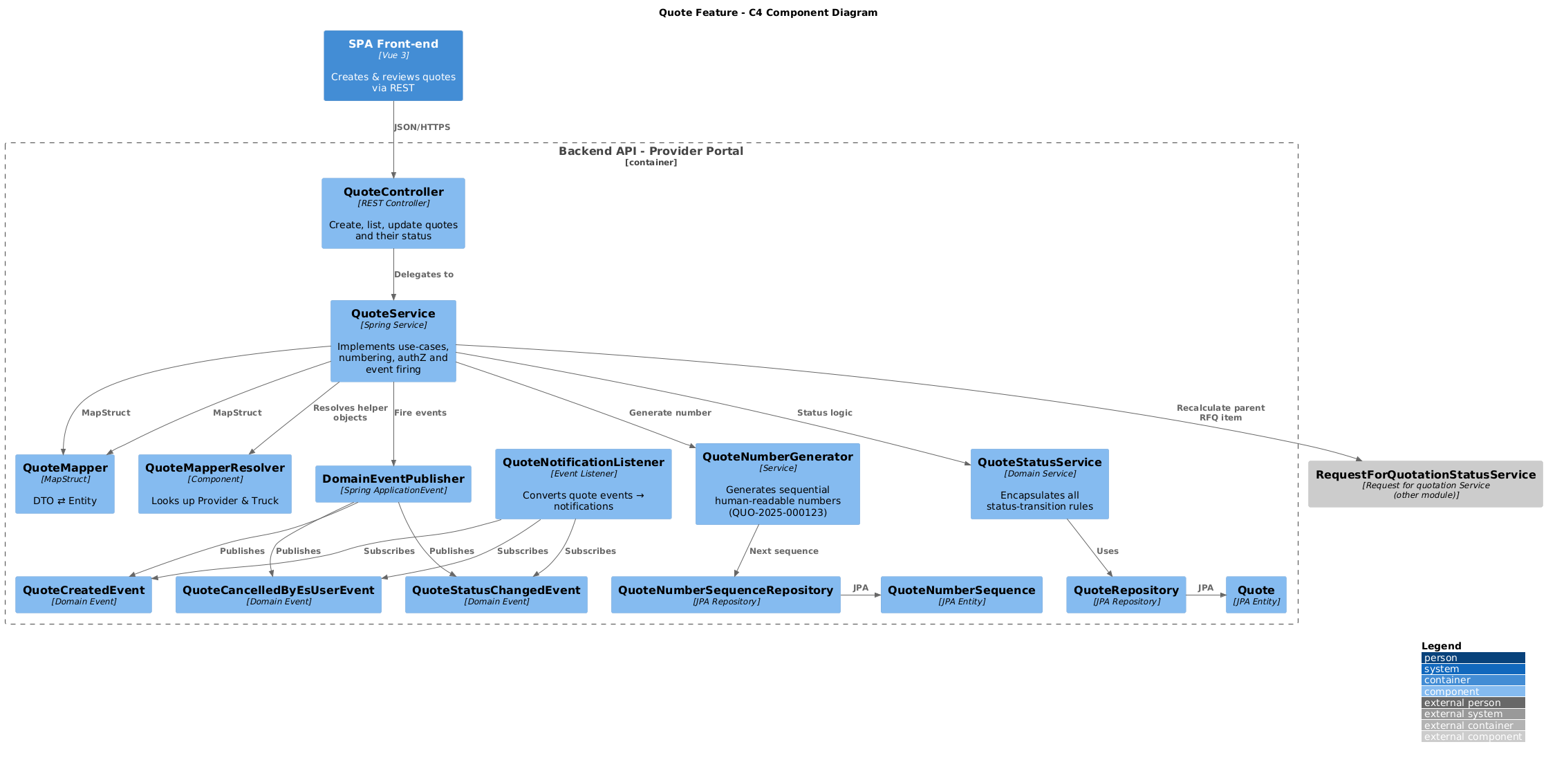 | QuoteService | Implements all quote use-cases; assigns numbers, authorises, validates; coordinates sub-services; fires domain events. | Java/Spring service (called only by the controller) | Repos, Status Service, Number Generator, Mapper, DomainEventPublisher, RequestForQuotationStatusService |