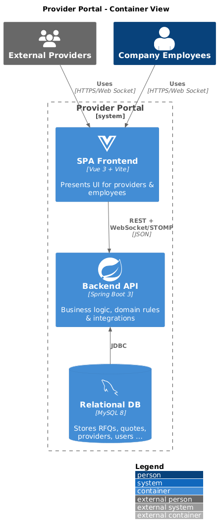 | Backend API | Implements domain use-cases (RFQ, Quote, Provider …), authentication/authorisation, notification dispatch, integration stubs for future PO & IMS links. |