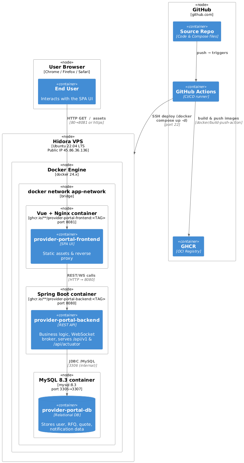 MySQL schema (provider-portal)mysql-db container → 3306/3307Mounted volume mysql_data; remote root login blocked (MYSQL_ROOT_HOST=%).